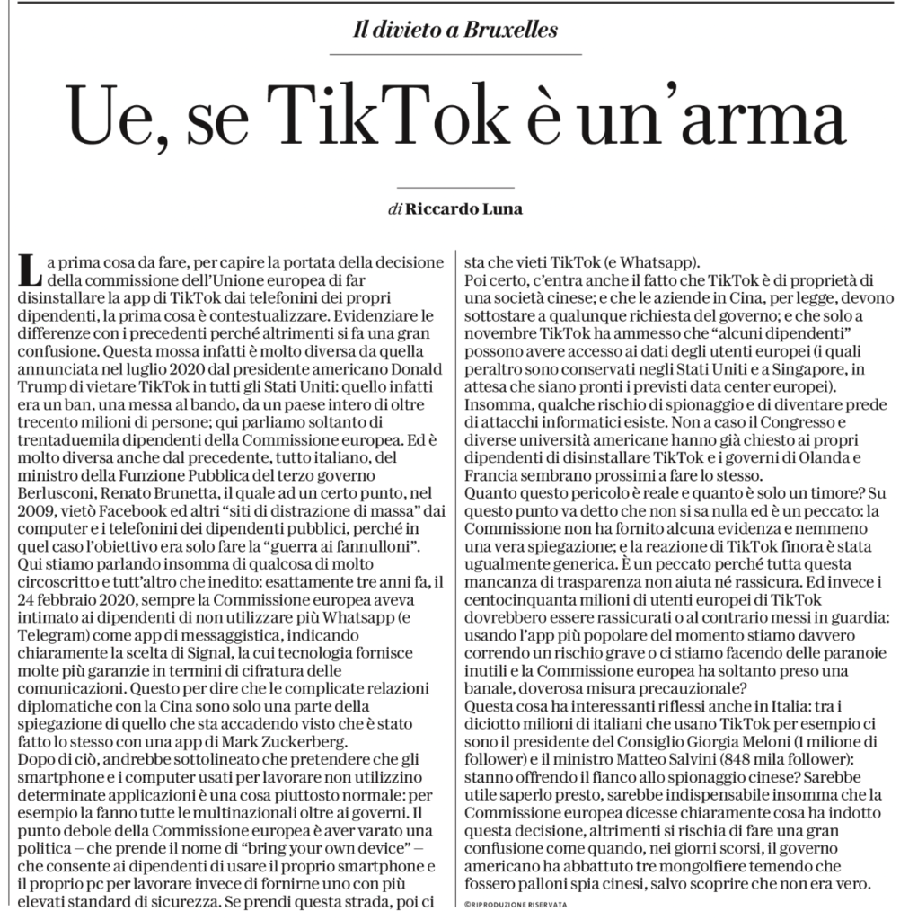 La Commissione europea ha richiesto a tutti i suoi dipendenti di disinstallare al più presto l’applicazione di TikTok dai dispositivi aziendali e dai dispositivi personali che accedono al servizio di telefonia mobile della Commissione. Questa informazione è stata confermata dall’esecutivo europeo. Il Gazzettino 23 febbraio 2023