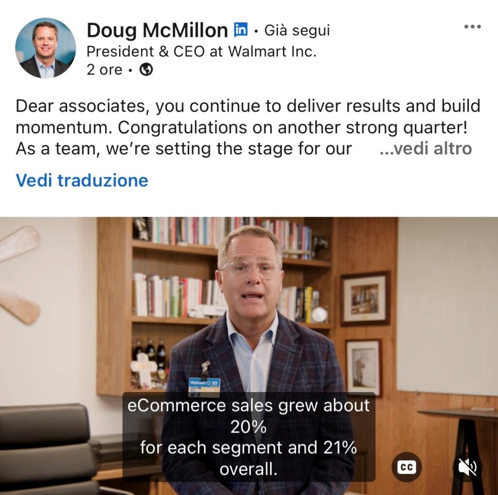Financial Times. E Doug McMillon, ceo di Walmart che, su LinkedIN, ha precisato che il marketplace ha espresso un + 42% e l’e-commerce un + 21%. I risultati sono stati ottenuti con 7’200 sconti (“rollback”), in forte incremento (+35%) nel settore alimentare. Il non food ha avuto crescita 0, cosa che non accadeva da 11 mesi. Redatto il 15 agosto, aggiornato il 16 agosto 2024