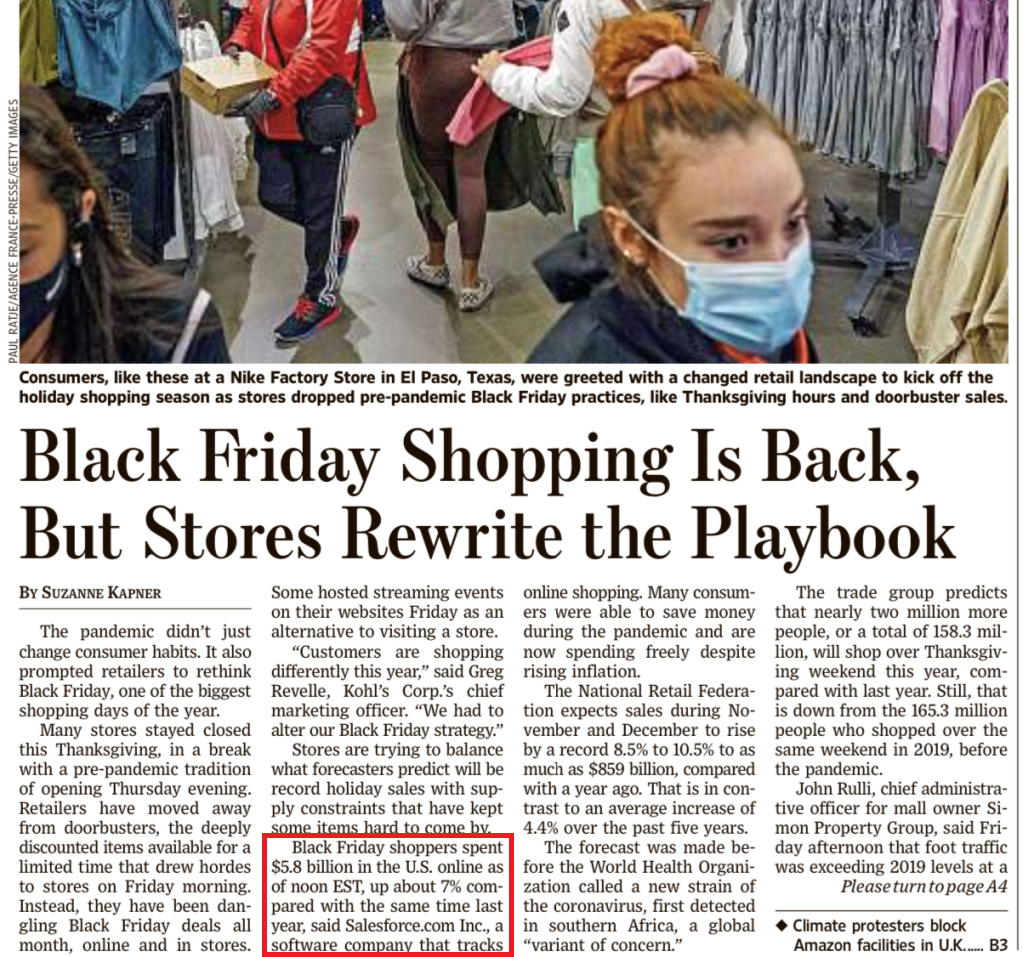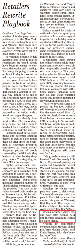Eventi streaming per Macy’s e Saks’s Fifth Avenue (grandi magazzini non food). Wall Street Journal 27 novembre 2021