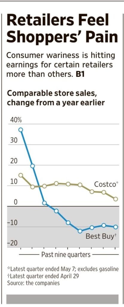 Prices also increased more than expected and the core inflation figure, which excludes energy and food, was revised up to 5 per cent from 4.9 per cent. Alcune catene, soprattutto non food, fanno fatica (WSJ 26 maggio 2023)