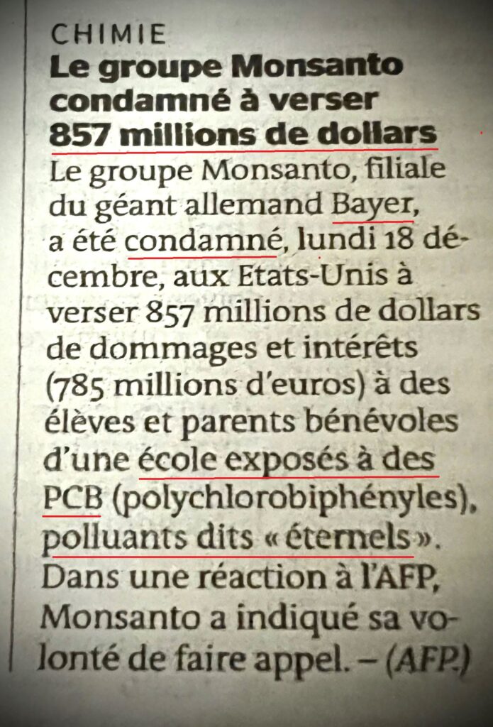 USA : il gruppo Monsanto, appartenente a Bayer, condannato a versare 867 milioni di $ alle vittime degli inquinanti eterni PCB