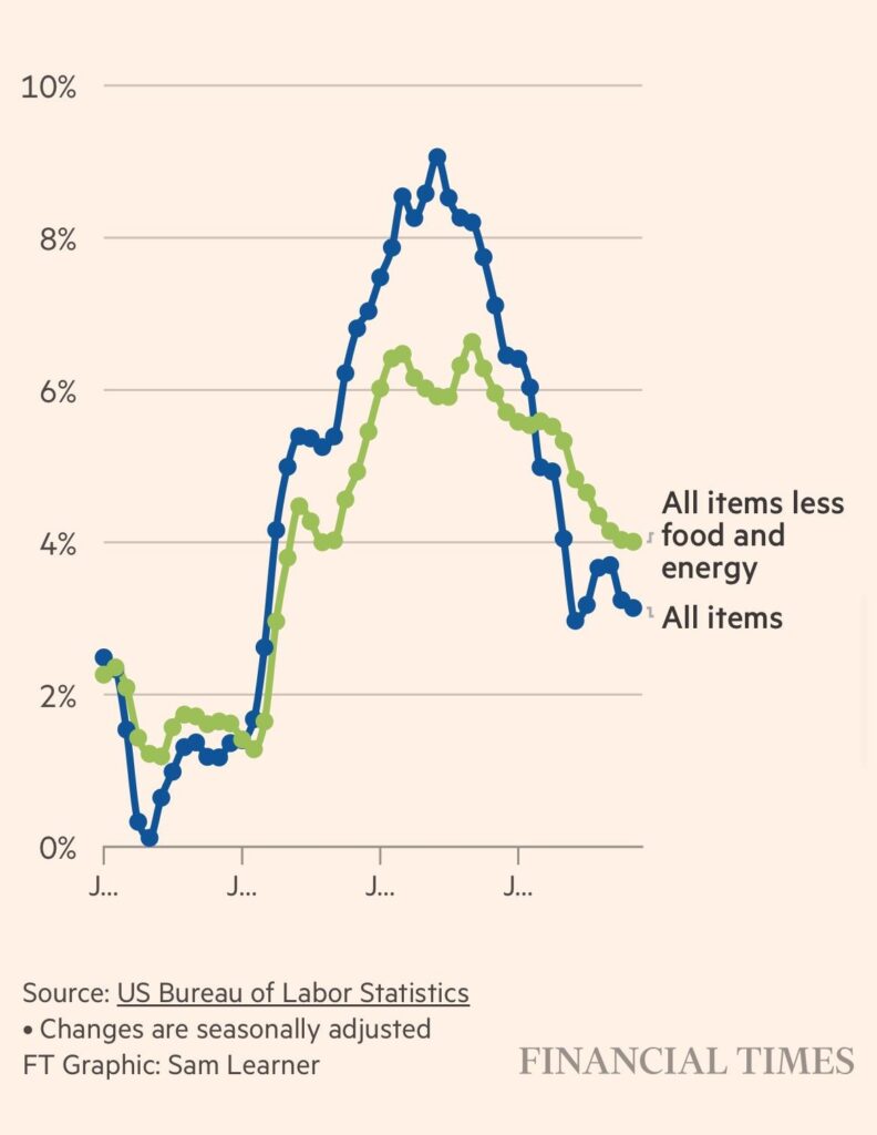 nell’ultimo mese ha segnato un + 0,3%. In discesa alimentari ed energia come si vede dallo schema sotto. FT 12 dicembre 2023