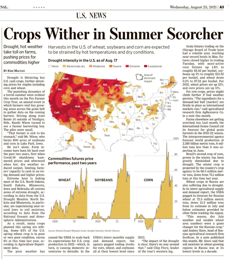 Prevista ulteriore inflazione (già superiore negli Stati Uniti al 5%) grazie al cambiamento climatico, Wall Street Journal 25 agosto 2021