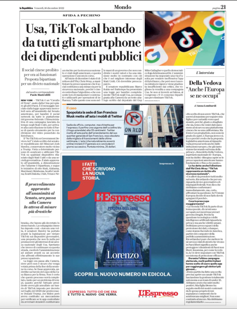 Repubblica 16 dicembre 2022. Su Tik Tok leggi qui.