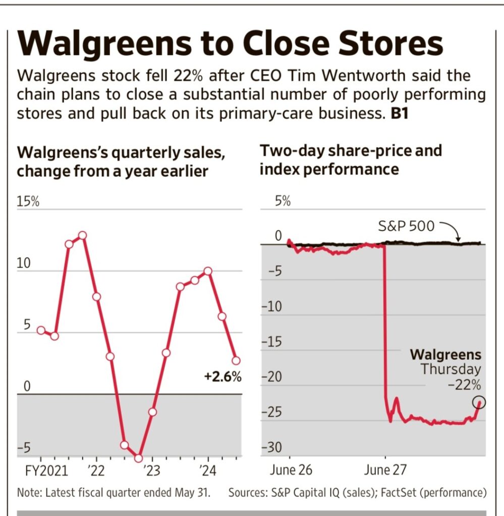 Attualmente ne ha 9000 per un fatturato pari a 27 miliardi di $: il 25% delle strutture di queta rete non sono redditizie. I suoi punti di vendita vendono farmaci e affini ma anche cibo. Il titolo, ieri, è sceso del 22% a Wall Street .