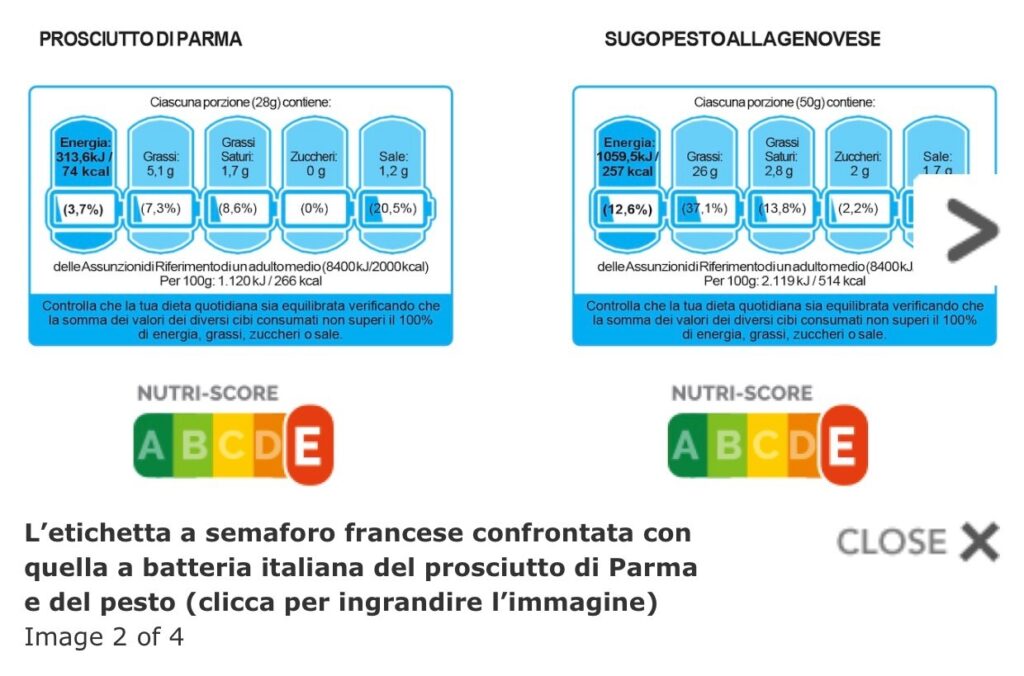 E’ stato pubblicato in gazzetta ufficiale e ora potrà essere riportato fronte pacco sugli alimenti prodotti in Italia. Il decreto del ministero dello Sviluppo economico stabilisce presentazione e condizioni di utilizzo della nuova etichettatura, in applicazione dell’art. 35 del regolamento Ue n. 1169/2011. Aziendeincampo 9 dicembre 2020. Sull’etichettatura a semaforo (Nutriscore) leggi questo articolo. Sotto le due etichettature a confronto : quella a batteria ha grosse difficoltà “di lettura” (i colori si confondono).
