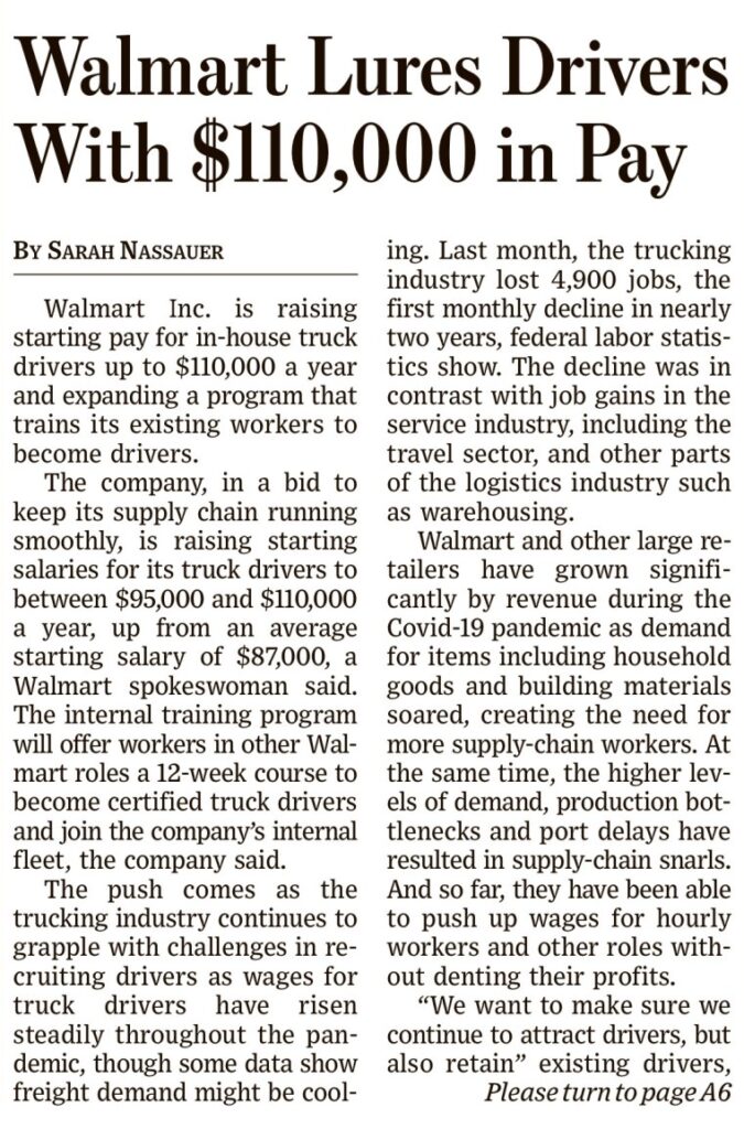 Wall Street Journal 8 aprile 2022. Le aziende USA, di fronte alla carenza di manodopera, “alzano il tiro”
