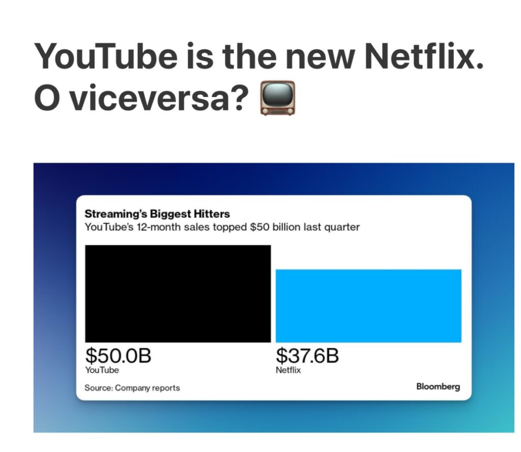 Netflix ha aggiunto oltre 20 milioni di nuovi abbonati durante quest’anno… Sembra un paradosso: invece di rendere Netflix più simile a YouTube, è YouTube che copia Netflix. I canali diventeranno le nuove serie TV, organizzate per stagione ed episodio. Ad oggi YouTube fa già numeri spaventosi sulle tv: gli utenti guardano più di 1 miliardo di ore di contenuti YouTube sui televisori ogni giorno e nel 2023, secondo Nielsen, YouTube è stato il leader assoluto nel tempo di visione in streaming negli Stati Uniti…E qui arriva la grande domanda per Netflix. Dal 2012, quando ha lanciato il suo primo original, ha speso oltre $120 miliardi in produzioni originali. YouTube, nello stesso periodo, ne ha spesi 0.