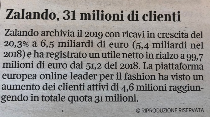 Utili praticamente raddoppiati. Zalando vende non food (scarpe, tessile e altro) solo via e-commerce. Corriere della sera del 28 febbraio 2020