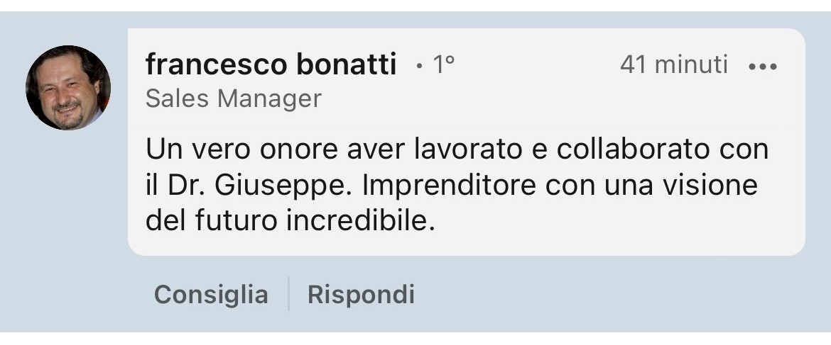 “Un vero onore aver lavorato e collaborato con il Dr. Giuseppe. Imprenditore con una visione del futuro incredibile”