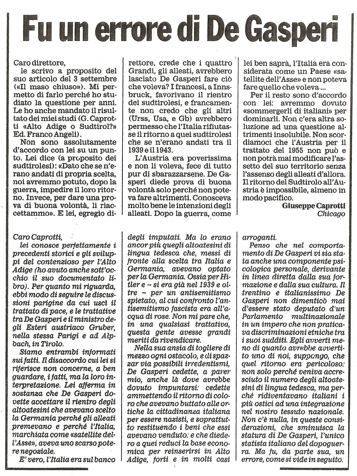 “Caro Caprotti, lei conosce perfettamente i precedenti storici e gli sviluppi del conenzioso per l’Alto Adige (ho avuto anche sott’occhio il suo documentato libro). Per quanto mi riguarda, ebbi modo di seguire le discussioni parigine da cui uscì il trattato di pace e le trattative tra De Gasperi e il ministro degli Esteri austriaco Gruber, nella stessa Parigi e ad Alpbach, in Tirolo. Siamo entrambi informati sui fatti. Il disaccordo cui lei si riferisce non concerne, a ben guardare, i fatti, ma la loro interpretazione.”