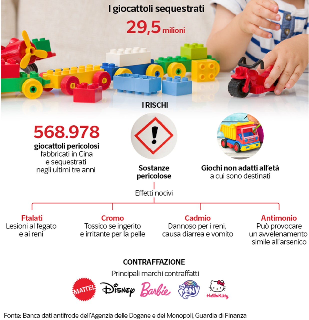 Nel caso dei giocattoli l’allarme è particolarmente forte perché spesso fabbricati con prodotti chimici dannosi per la salute: sono stati trovati giochi con ftalati (aggiunti alle materie plastiche per migliorarne la flessibilità e la modellabilità). Negli articoli destinati all’infanzia non dovrebbero avere concentrazioni superiori allo 0,1% perché i bambini li masticano e li succhiano, e queste sostanze possono provocare lesioni al fegato e ai reni, anomalie del sistema riproduttivo, come l’atrofia testicolare e la riduzione della produzione spermatica. È stata trovata presenza di cromo (utilizzato per smalti e vernici), molto tossico se ingerito e irritante per gli occhi, la pelle e per le mucose; di cadmio, contenuto in macchinine metalliche, giochi in plastica o legno verniciati, bigiotteria per bambine e che a contatto con la saliva si scioglie e può venire ingerito causando nausea, vomito, diarrea ed effetti dannosi sui reni. Negli ultimi tre anni i giocattoli pericolosi fabbricati in Cina e sequestrati in ingresso in Italia sono stati oltre 560 mila (per un valore di mercato stimato di oltre 2 milioni e 700 mila euro). Il 30% di bambolotti prodotti e commercializzati nella Repubblica cinese contiene dosi massicce di metalli pesanti, che rischiano di danneggiare gravemente la salute dei più piccoli; e una parte arrivano anche in Italia. Poi ci sono i giochi non adatti all’età dei bambini a cui sono destinati, per la presenza di piccole parti che si staccano e possono essere ingoiati e provocare asfissia.