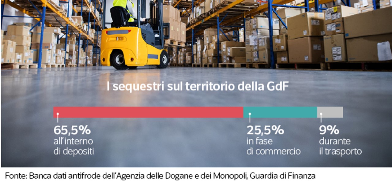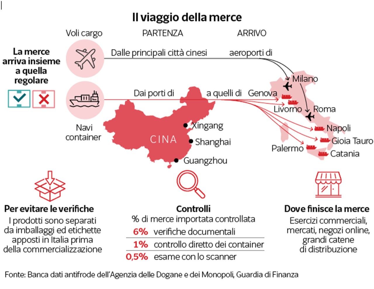 Nonostante i grandi quantitativi, in termini economici di mercato quello che arriva illegalmente dalla Cina pesa 50,3 milioni di euro, su un totale delle importazioni illecite intercettate di 133,9 milioni. Un valore basso proprio perché la Repubblica cinese è specializzata in esportazione illegale di prodotti a basso prezzo. La merce viaggia insieme a quella regolare tramite navi container, voli cargo, oppure attraversando i confini terrestri dopo lo sdoganamento in altri Paesi dell’Unione dove i controlli sono meno rigidi. Le ispezioni scattano al momento dell’attraversamento del varco doganale e sono eseguite in base ad algoritmi, oppure a seguito di informazioni acquisite in tempo reale da un sistema informativo condiviso da tutti gli Stati dell’Unione Europea. I principali parametri considerati sono: importatore, ditta produttrice, vettore, qualità e tipo di merce. Si tratta di una attività che ritarda tutta la logistica, per questo viene mediamente controllato solo il 6% della merce importata attraverso verifiche documentali, poco meno dell’1% con l’apertura dei pacchi nei container, e lo 0,5% passa sotto lo scanner. Per aggirare le diverse procedure di controllo, i prodotti spesso circolano separati negli imballaggi o senza etichette, che vengono apposte in Italia dopo lo sdoganamento e prima della commercializzazione. Una volta entrata nel territorio nazionale, una parte della merce viene smerciata direttamente sulle bancarelle, perché prive di controllo, ma una grande quantità finisce in esercizi commerciali, grandi catene di distribuzione e negozi online.
