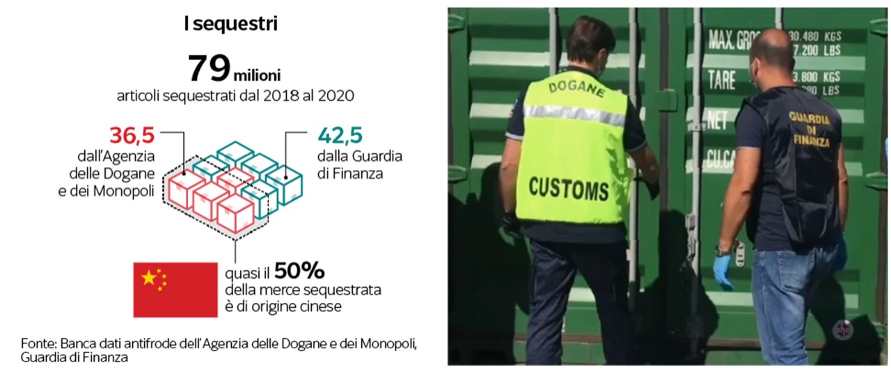 Dal 2018 all’aprile 2021 solo l’Agenzia delle Dogane ha sequestrato in ingresso complessivamente 81,4 milioni di articoli illegali, di questi 36,5 milioni sono cinesi. Il reato più comune è la contraffazione. Ai varchi doganali sono stati intercettati 2,5 milioni di articoli di falso made in Italy e altrettanti contraffatti: giocattoli, carte da gioco, articoli per le feste, automobiline, bambole e peluche che violano principalmente i marchi Mattel, Walt Disney, Little Pony, Barbie, Hello Kitty. Mentre nel 2020, l’anno della pandemia, il 68% della merce bloccata perché falsa ha riguardato accessori personali ovvero borse, occhiali da sole, bigiotteria, orologi marcati Rolex, Patek Philippe, Bulgari che spesso poi entrano nel circuito legale corrompendo la catena di distribuzione. Il 17% sono calzature, il 10% abbigliamento, il 2% cellulari e loro parti, l’1% giocattoli, il resto apparecchi elettronici, come le casse audio per l’auto.