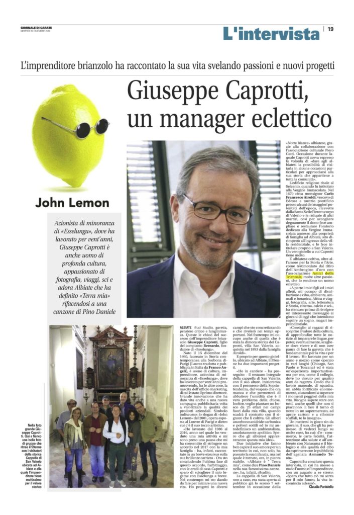 Azionista di minoranza di «Esselunga», dove ha lavorato per vent’anni, Giuseppe Caprotti è anche uomo di profonda cultura, appassionato di fotografia, viaggi, sci e adora Albiate che ha definito «Terra mia» rifacendosi a una canzone di Pino Daniele