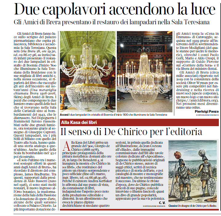 Gli Amici di Brera fanno luce sullo scrigno del palazzo piermariniano che ospita pinacoteca, biblioteca e accademia: la Sala Teresiana. Questa sera (via Brera 28, ore 19.30, tel. 02.86.07.96, su invito) sarà infatti presentato il restauro dei due lampadari in cristallo di Boemia d’inizio ’800 che illuminano la Sala Teresiana della Braidense con le sue migliaia di libri antichi e,nella stessa occasione, si riparlerà del libro che raccoglie gli atti dell’incontro sui novant’anni (Una meraviglia chiamata Brera 1916-2016, Skira) degli Amici di Brera. I pezzi che compongono le due lumiere erano quelli delle luci che si trovavano nella Sala delle Cariatidi sino ai bombardamenti del 1943, che le distrussero. Nel Dopoguerra i frammenti furono riassemblati nelle due grandi lumiere, ora restaurate grazie al sostegno di Giuseppe Caprotti.