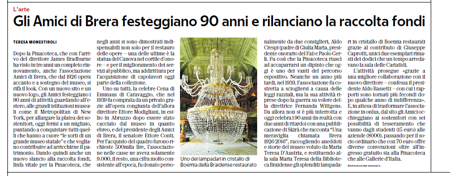 Da allora non si è più interrotta oggi celebra i 90 anni (in realtà con due anni di ritardo) con una pubblicazione di Skirà che racconta “Una meraviglia chiamata Brera 1926-2016”, raccogliendo aneddoti e storie del museo voluto da Maria Teresa D’Austria, e restituendo alla sala Maria Teresa della Biblioteca Braidense gli splenditi lampadari in cristallo di Boemia restaurati grazie al contributo di Giuseppe Caprotti, unici due esemplari rimasti dei dodici che un tempo arredavano la sala delle Cariatidi.