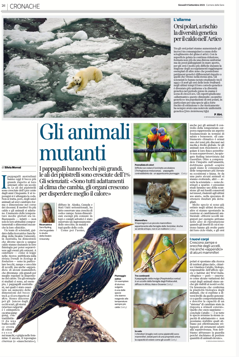 Un team di scienziati, guidato dalla ricercatrice Sara Ryding della Deakin University, in Australia, ha dimostrato che diverse specie a sangue caldo stanno mutando la loro fisiologia per poter sopravvivere agli eventi più estremi. A cambiare — come si legge nella ricerca pubblicata sulla rivista Trends in Ecology & Evolution — sono in particolare becchi, zampe e orecchie di uccelli, ma anche «appendici» di alcuni mammiferi, che diventano più grandi per meglio regolare la dispersione del calore.