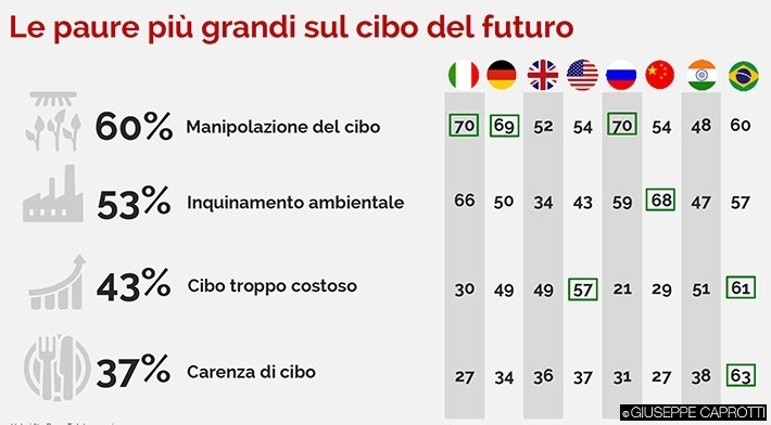 A questo punto Doxa (chart da Retailwatch di Luigi Rubinelli) evidenzia le paure di italiani, tedeschi, britanici, statunitensi, russi, cinesi, indiani e brasiliani
