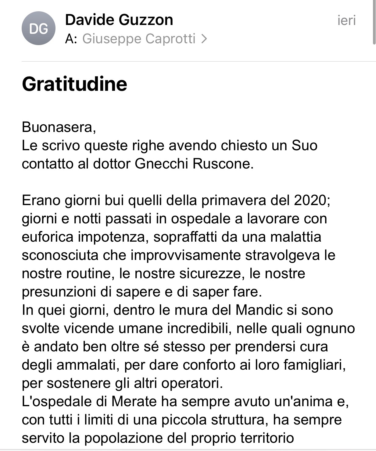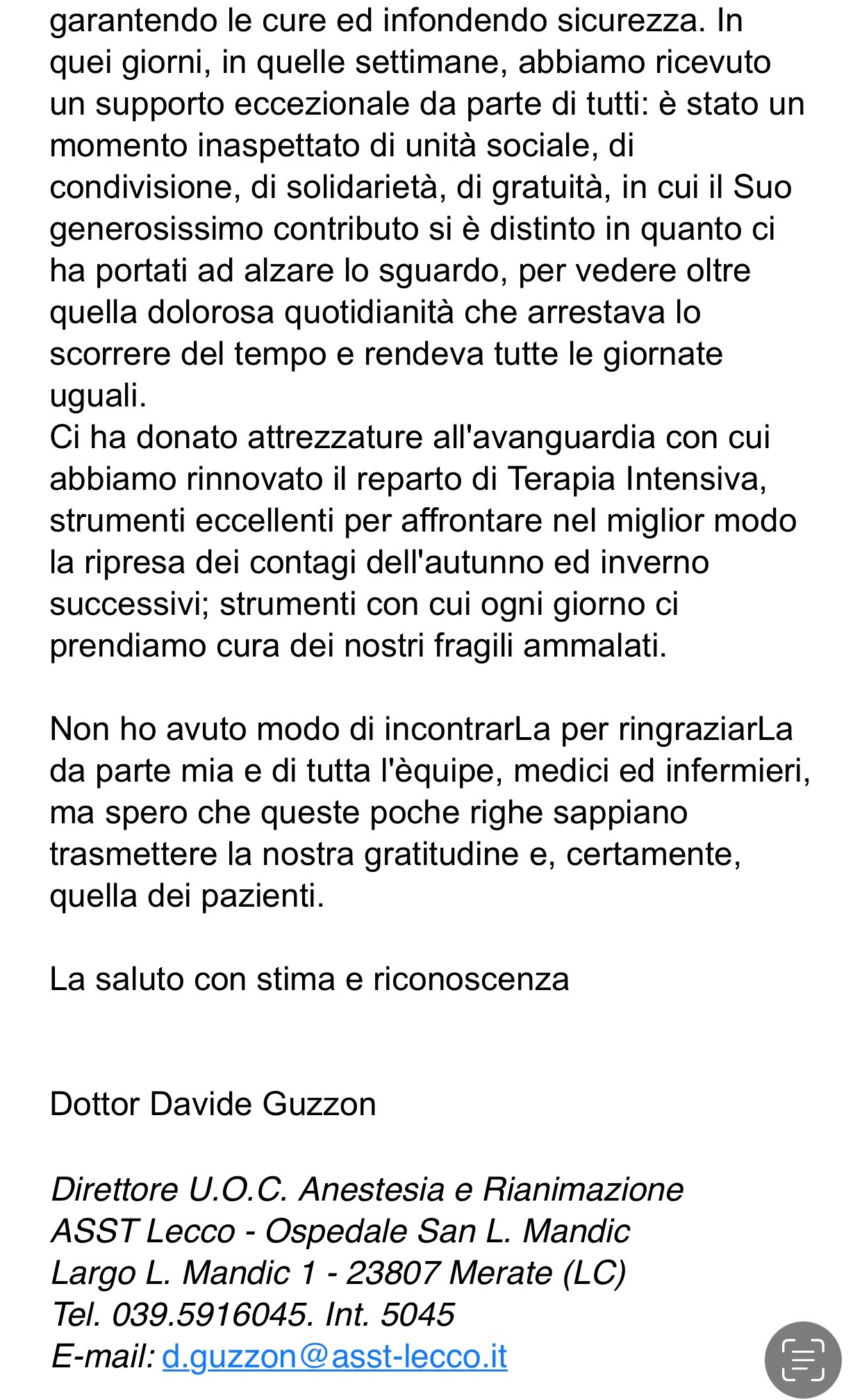 L’ospedale di Merate ha sempre avuto un’anima e, con tutti i limiti di una piccola struttura, ha sempre servito la popolazione del proprio territorio garantendo le cure ed infondendo sicurezza. In quei giorni, in quelle settimane, abbiamo ricevuto un supporto eccezionale da parte di tutti: è stato un momento inaspettato di unità sociale, di condivisione, di solidarietà, di gratuità, in cui il Suo generosissimo contributo si è distinto in quanto ci ha portati ad alzare lo sguardo, per vedere oltre quella dolorosa quotidianità che arrestava lo scorrere del tempo e rendeva tutte le giornate uguali.