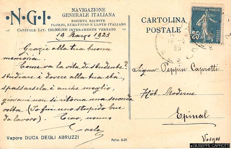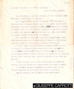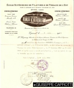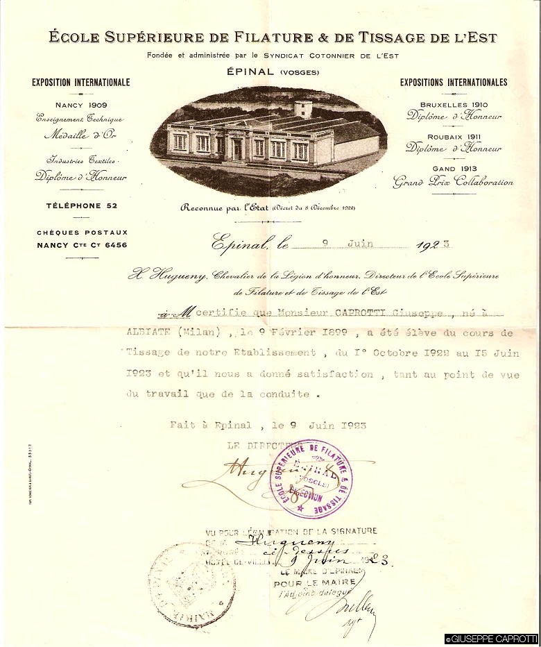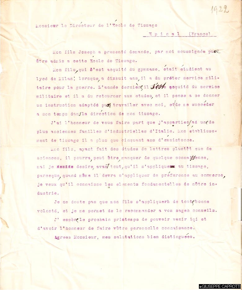 Il primogenito di Bernardo 2 Caprotti, Giuseppe 3 (padre di Bernardo e nonno di Giuseppe Caprotti) , nato nel 1899, era lietamente occupato in tutt’altri interessi della propria gioventù – macchine, avvenenti signorine, tutti interessi fra l’altro condivisi col suo mentore, lo zio Guido 1 –, quando il padre pensò bene di iniziare il suo addestramento di futuro capo dell’azienda di famiglia mandandolo in Francia, e precisamente a Épinal, sui Vosgi, nella zona di Nancy, a frequentare la Scuola superiore di filatura e tessitura dell’Est (École supérieure de filature et de tissage de l’Est), cui presentò domanda, in un francese tutto da leggere, con una lettera databile al 1922.