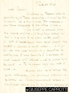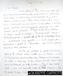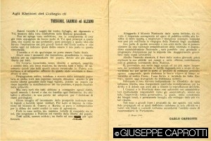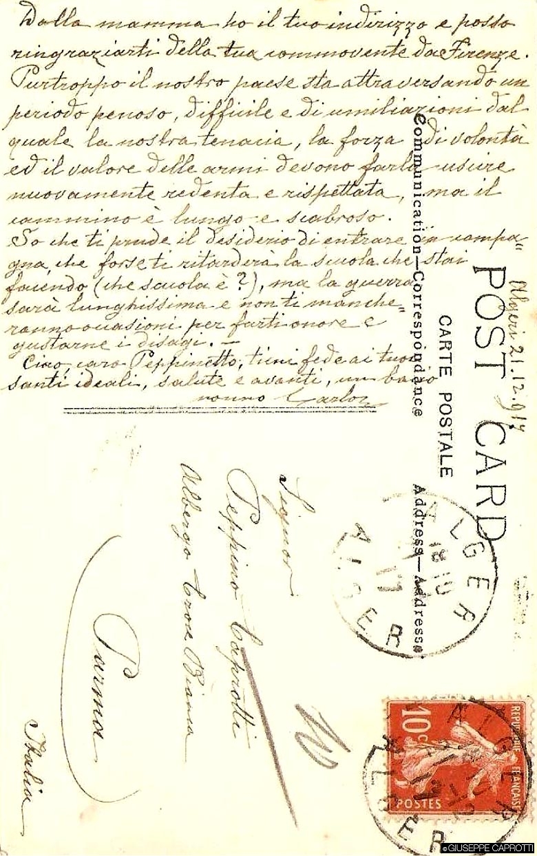 Non si va lontani se si pensa che un simile stato d’animo improntava anche Giuseppe, il quale, soldato del Genio telegrafisti, dislocato a centinaia di chilometri dal fronte, vide sfumare le sue eroiche aspirazioni, e quindi iniziò quasi subito a scalpitare, anche se il nonno Bernardo 1, il quale allora soggiornava ad Algeri, lo invitava, con la prudenza dell’età e del senso della realtà caprottiano, a tener fede ai suoi santi ideali, ma anche a non aver fretta, ché tanto la guerra sarà lunghissima e non ti mancheranno occasioni per farti onore e gustarne i disagi.