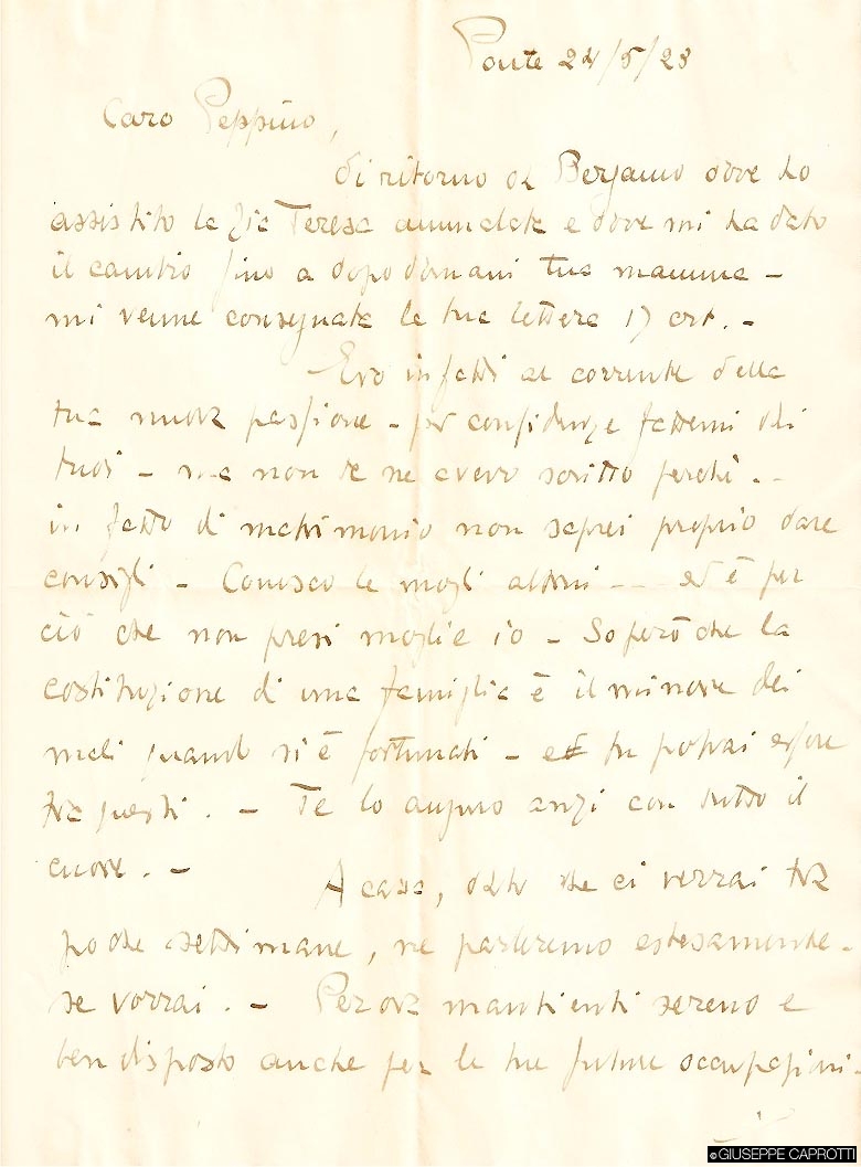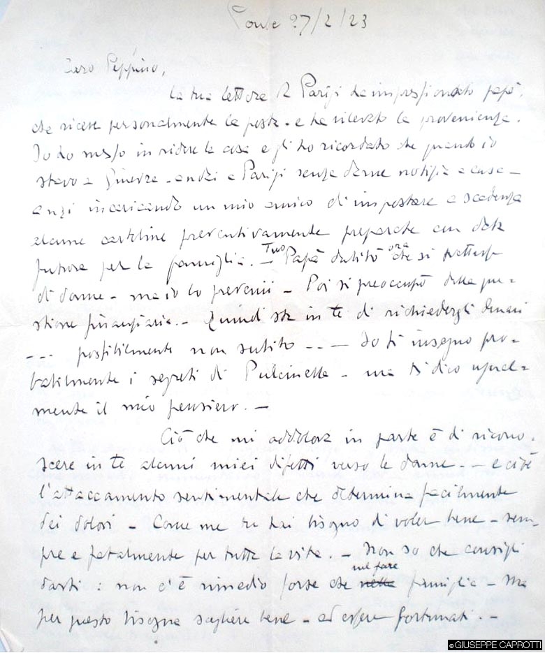 Il 27 febbraio 1923 gli scriveva che la sua lettera aveva impressionato il padre, uomo peraltro abbastanza ansioso; lui aveva cercato di calmarlo buttando la cosa sul ridere, ricordandogli che quando stava a Ginevra si guardava bene dal mandare notizie a casa, anzi, incaricava un amico d’impostare a scadenza alcune cartoline preventivamente preparate con data futura per la famiglia. Bernardo ora sapeva trattarsi di donne, e si preoccupò;poi si preoccupò della posizione finanziaria. Quindi stava a Giuseppe chiedergli denari – possibilmente non subito, consigliava lo zio, il quale proseguiva preoccupandosi nel vedere in lui parte dei suoi difetti nei confronti delle donne, a cominciare dall’attaccamento sentimentale.