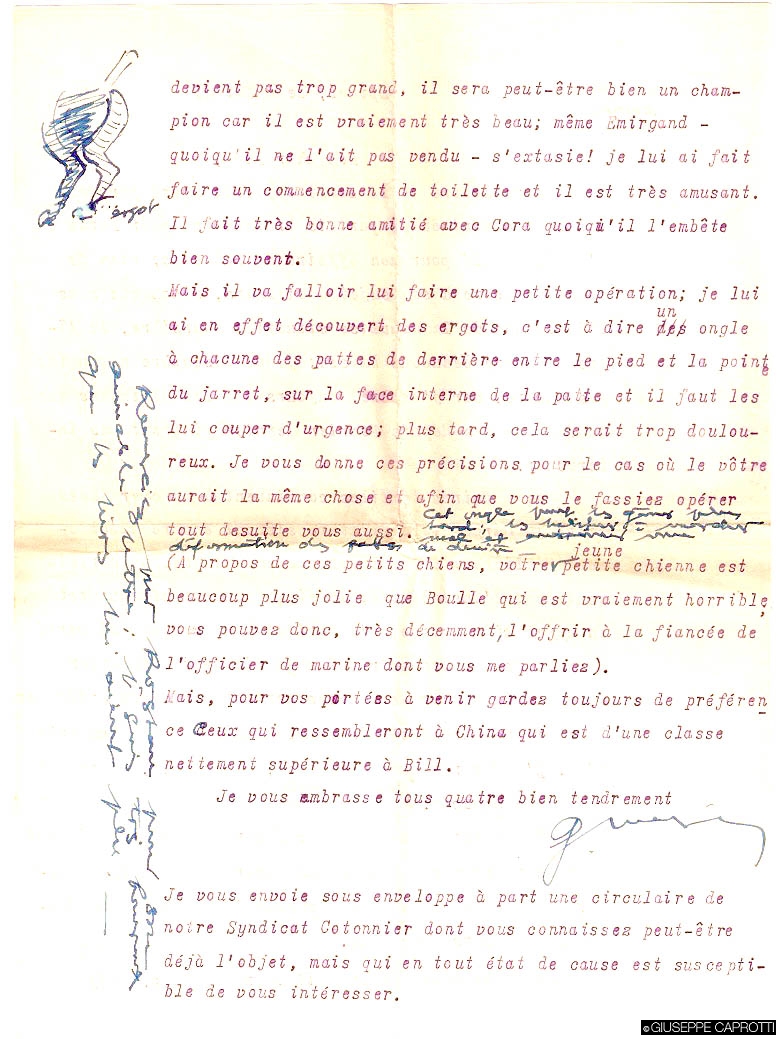Da parte loro, i suoceri Maire sembravano volergli molto bene, e lo trattavano con affetto e confidenza: nelle lettere, la suocera lo chiamava mon petit Peppino, e parlava con accenti lirici della felicità della figlia e dei progressi dei nipotini; il suocero l’appellava mon cher Pepp, gli parlava di affari, ma anche di auto – Giuseppe ne era appassionato quanto lui – e di cani, di cui riportava anche disegnini dei “quarti posteriori”, a dimostrazione di quanta soddisfazione un cane di razza potesse dare.