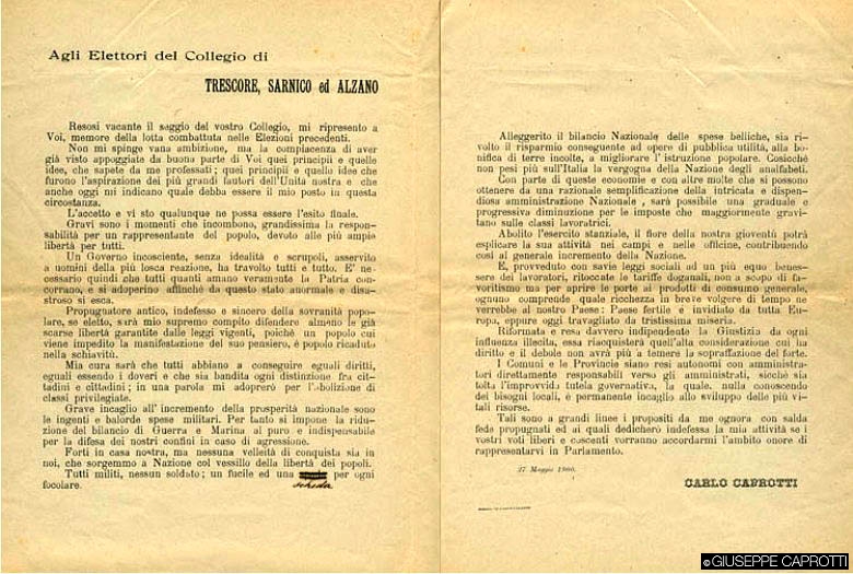 Questa sorta di “pragmatismo patriottico”, grazie al quale fratelli Caprotti cercarono sì di dare un contributo alla patria che chiamava, ma sempre a capo torto verso i propri affari, usando peraltro, in seguito, i grandi discorsi patriottici solo per convincere gli ex clienti veneti, rimasti sotto il dominio austroungarico, a riprendere i rapporti commerciali con loro, può aiutare anche a comprendere l’impegno politico in seguito ampiamente svolto.