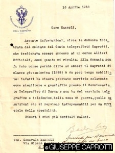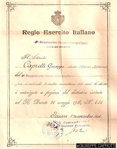 Nato nel febbraio 1899, Giuseppe 2 Caprotti era di leva quando fu chiamato alle armi, nel 1917. Fu destinato al III Reggimento Genio, compiendo a Firenze l’istruzione militare. Da lì ebbe quale destinazione Parma, assegnato al plotone autonomo telegrafisti presso la Delegazione Commissariato Telegrafico della città.
