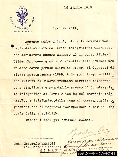 Giuseppe coinvolse il padre, gli chiese tutti gli appoggi possibili; e Bernardo scriveva a destra e a manca, arrivava fin dove poteva con chi avrebbe potuto mettere una buona parola per il figlio aspirante eroe, ma la risposta, a un bel momento, giunse chiara: dalla segreteria del Sottocapo di Stato maggiore dell’esercito, il 16 aprile, si scriveva che alla domanda del soldato Caprotti non fu dato seguito perché oltre a essere di classe giovanissima era mobilitato da troppo poco tempo: infatti, sino a quel momento, aveva prestato servizio solamente come stenditore e guardafilo presso il Commissariato telegrafico di Parma, e non aveva quindi del servizio telegrafico e telefonico della zona di guerra quelle cognizioni che si reputano indispensabili per un ufficiale della specialità.