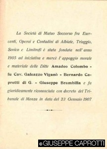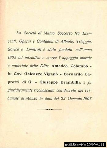 Bernardo Caprotti rimase in effetti sempre molto attento alle istanze sociali che lo circondavano, in un’epoca in cui l’industrializzazione scomponeva l’antico modo di vivere, creava nuovi bisogni, nuove sperequazioni, nuove povertà cui bisognava ingegnarsi di porre rimedio. Ad esempio, negli stabilimenti Caprotti vigevano norme antinfortunistiche al passo con le ultime indicazioni mediche e tecniche (54); e nell’ambito assistenziale, di cui ancora il settore pubblico non si faceva carico come al giorno d’oggi, Bernardo s’inserì con i tipici interventi da “buon padre di famiglia” che nei secoli aveva distinto i maggiorenti, e aveva portato, sin da epoche remote, alla fondazione e al sostegno economico di quella fittissima rete di istituzioni benefiche, grandi o piccole, che furono peculiarità e vanto delle terre lombarde. Il Caprotti, infatti, concorse anche alla fondazione della Società di mutuo soccorso fra esercenti, operai e contadini di Albiate, Triuggio, Sovico e limitrofi con sede in Ponte Albiate (1905), avente quale scopo – come per tutte le Società di questo genere – non solo quella che all’epoca veniva definita l’elevazione morale degli iscritti, promuovendone l’istruzione e l’educazione, ma soprattutto fornir loro aiuto in caso di malattia e infortuni, che a quel tempo, per le persone più povere, significavano praticamente con certezza, da un giorno all’altro, la completa indigenza per sé e per le famiglie.