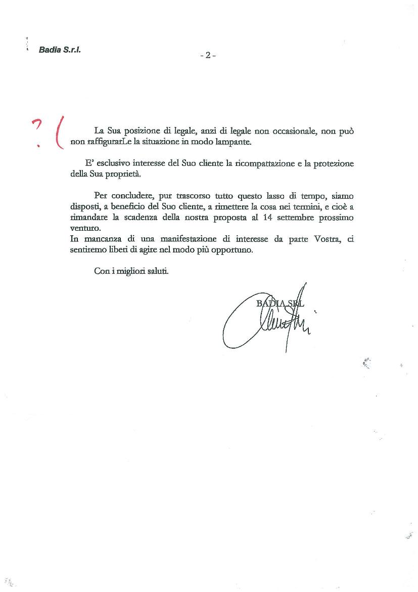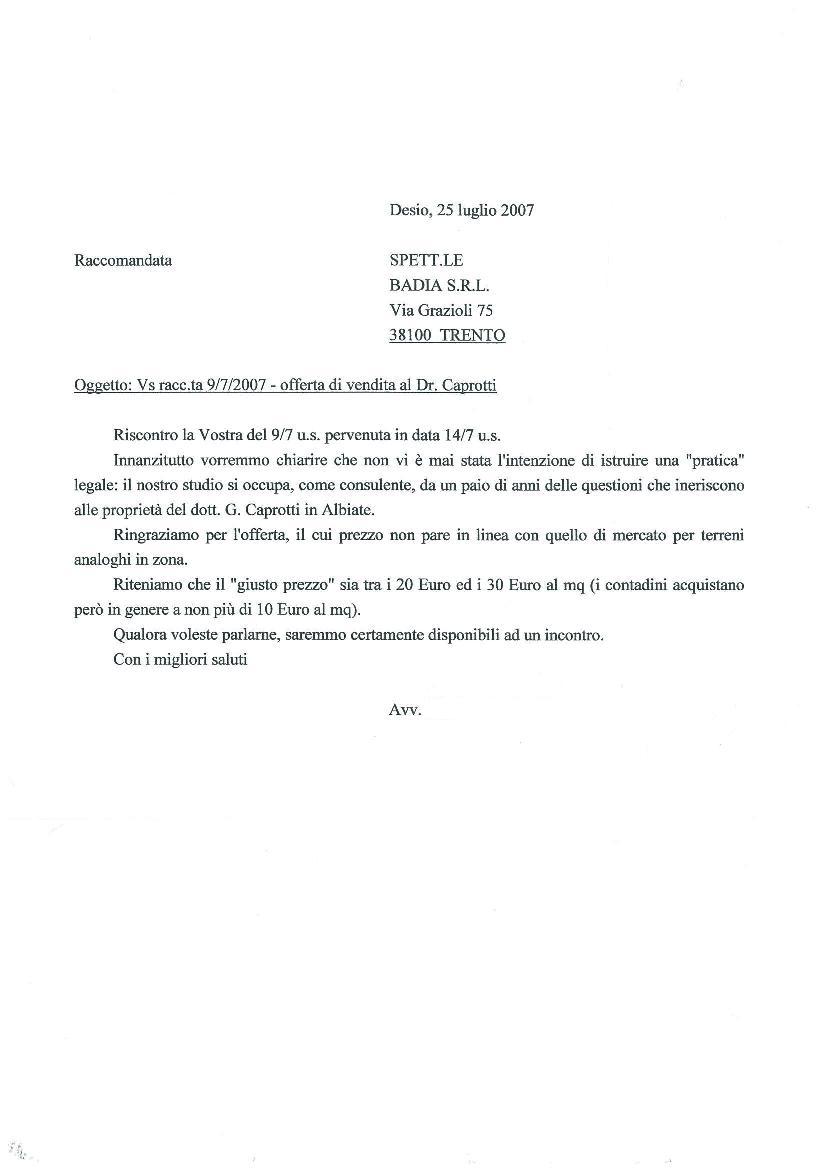 Il mio avvocato rispondeva alla Badia prospettando un incontro per discutere dei valori a pertica di terreno che parevano più elevati del solito