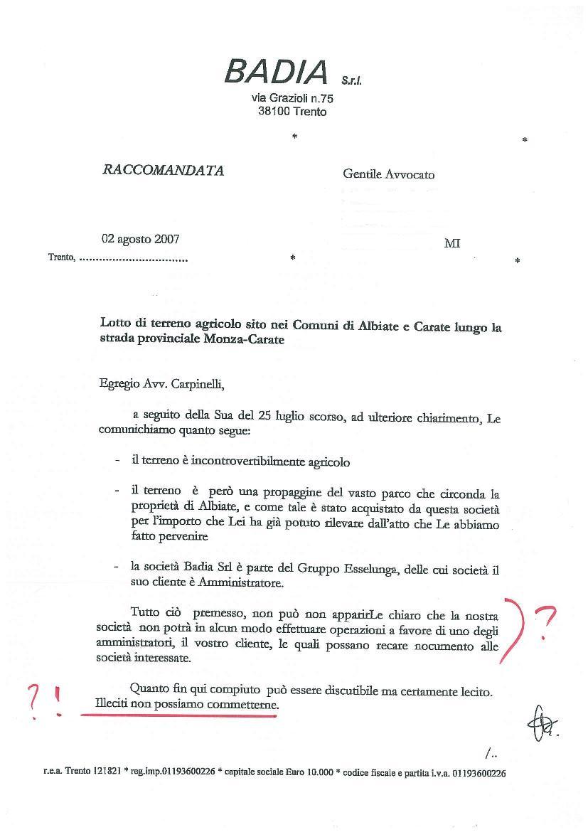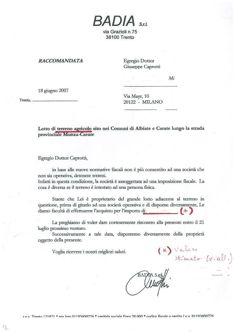 A giugno 2007 la Badia S.r.l., società del Gruppo Esselunga, mi scriveva offrendomi la possibilità di acquistare un terreno che si trova accanto ai terreni agricoli che già possedevo accanto a casa mia, ad Albiate, in Brianza.