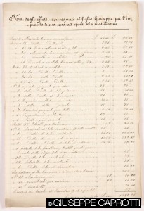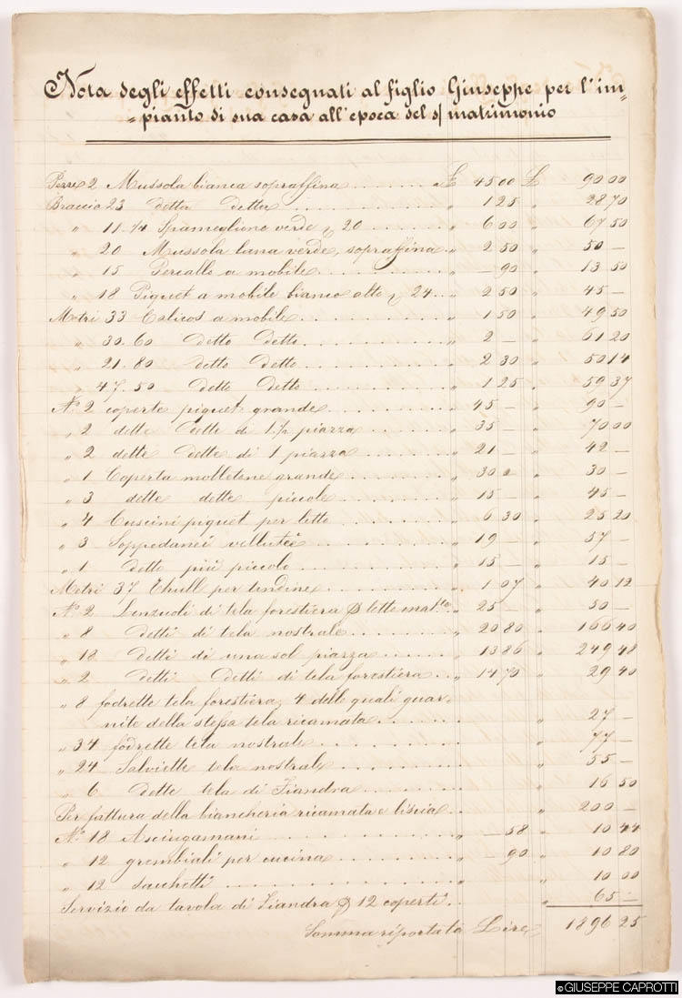 senza data [ma 1863] Nota degli effetti consegnati al figlio Giuseppe per l’impianto di sua casa all’epoca del suo matrimonio mm. 250×370 Nota delle forniture di arredi e biancheria consegnate da Bernardo Caprotti al figlio Giuseppe all’epoca del suo matrimonio con Giuseppina Polti.