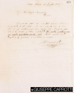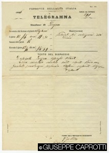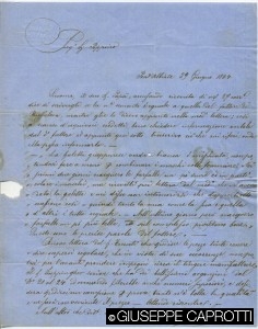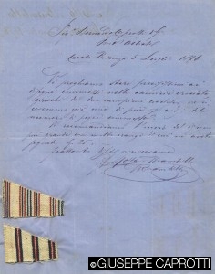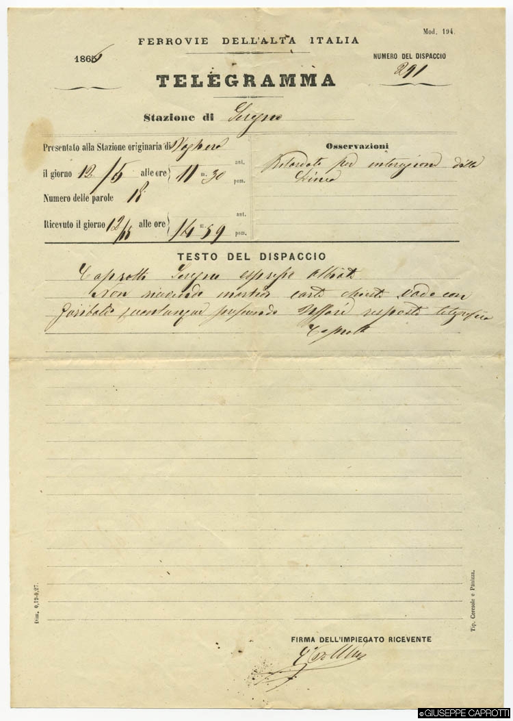 1866 maggio 12, Voghera L’ussaro Carlo Caprotti mm. 275x195Nel maggio 1866, quando si stava preparando la Terza guerra d’indipendenza, Carlo Caprotti, fervente patriota, praticamente scappò di casa per arruolarsi nel reggimento Ussari di Piacenza, piantando in asso il fratello Giuseppe e gli affari della ditta (ma continuando a dispiacersene). Il 12 maggio scriveva a Giuseppe un telegramma col tono che avrebbe poi contraddistinto tutta la sua breve permanenza nell’esercito: Caprotti Seregno espresso Albiate./Non ricevendo martedì carte chieste, vado con Garibaldi, quantunque preferendo affari. Risposta telegrafica./Caprotti.Il 16 maggio faceva scrivere da un sottoposto che il signor Carlo è arruolato e completamente vestito, è un bell’ussero, ma aveva pochissimo tempo per occuparsi d’altro che del deposito di Voghera cui era stato assegnato. Si stancò ben presto dei tediosi compiti che gli erano toccati, dell’atmosfera che regnava – gli rubarono pure il portamonete –, e scriveva al fratello di non vedere l’ora di poter tornare a casa per occuparsi dei suoi affari, come risulta da una lettera del 16 agosto in cui, peraltro, comunicava a Giuseppe di non farsi vedere a Voghera prima di dieci giorni, dovendo scontare una punizione per essersi finto malato.