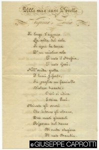 1875, 1891 e senza data L’educazione e il ruolo delle donne: le sorelle Caprotti, figlie di Bernardo e Carolina Candiani. Come tutte le ragazze di buona famiglia, le cinque sorelle Caprotti furono educate negli istituti riservati all’istruzione femminile, ove imparavano quelle che, di fatto, erano una delle principali componenti immateriali della dote da portare al futuro coniuge: la padronanza della buona educazione, della conversazione, delle pratiche religiose e di beneficenza, nonché della musica e delle arti applicate come il ricamo, la pittura finalizzata alla creazione di quadretti e ceramichine (lavori che poi venivano disseminati per tutta la casa o nelle chiese) o, come si vede da questi esempi, la bella calligrafia e l’arte dello scrivere, anche in poesia. Le donne Caprotti furono sempre presenti nelle istituzioni benefiche locali – non si dimentichi che esisteva ad Albiate l’“Opera pia Candiani-Caprotti” per l’assistenza ai vecchi e agli infermi –, e arricchirono la chiesa parrocchiale di inginocchiatoi, calici e paramenti sacri, affermando anche così, nel proprio ambito sociale, e con mezzi visivi da tutti immediatamente percepibili, l’importanza e il posto di preminenza ricoperto dalla loro famiglia nella comunità.
