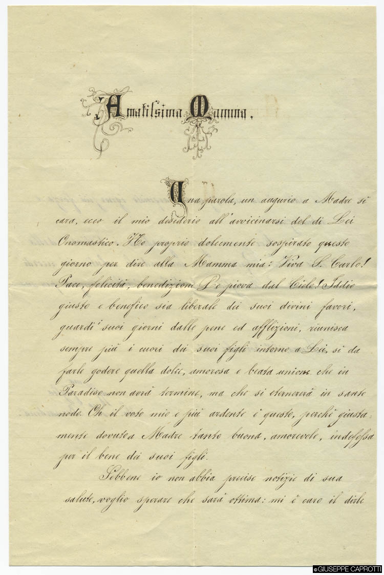 1875 novembre 2, Monza Lettera di auguri di Leopoldina Caprotti (suor Maria Bernardina) alla madre Carolina in occasione dell’onomastico mm. 210×135