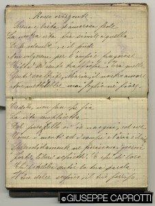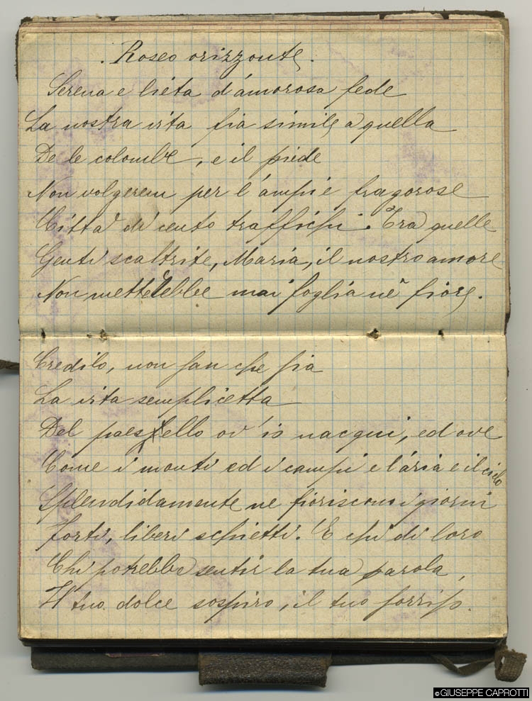 1887Taccuino di poesie di Antonio Caprotti mm. 75x110Antonio, figlio di Bernardo, morto neppure trentenne, fu un adolescente indisciplinato e disastroso negli studi, fors’anche perché, al contrario dei fratelli, non era assolutamente portato per gli affari, preferendo scrivere lettere e poesie d’amore, come quelle contenute in questo piccolo taccuino del quale viene esposta (e di seguito trascritta) la poesia dal titolo Roseo orizzonte:Serena e lieta d’amorosa fede/La nostra vita sia simile a quella/De le colombe, e il piede/Non volgerem per l’ampie fragorose/Città di cento traffici. Tra quelle/Genti scaltrite, Maria, il nostro amore/Non metterebbe mai foglia né fiore./Credilo, non fan che sia/La vita semplicetta/Del paesello ov’io nacqui, ed ove/Come i monti ed i campi e l’aria e il cielo/Splendidamente ne fioriscono i giorni/Forti, liberi e schietti. E chi di loro,/Chi potrebbe sentir la tua parola/Il tuo dolce sospiro, il tuo sorriso.