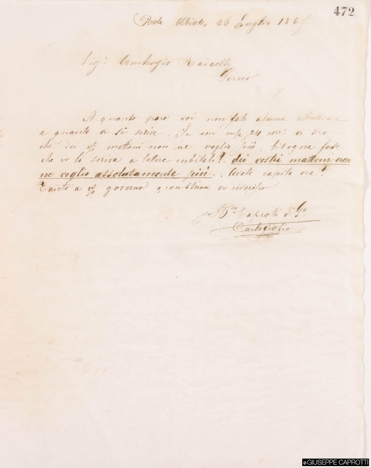 1867 luglio 26, Ponte Albiate Lettera di Carlo Caprotti ad Ambrogio Radaelli, di Gerno. In Corrispondenza e fatture dal 15 aprile al 31 luglio 1867 – 2, foglio 472 Registro copialettere, mm. 300x245I numerosi copialettere, dove veniva ricopiata tutta la corrispondenza spedita ogni giorno, sono fonte preziosissima per lo studio dell’andamento quotidiano dell’azienda. Vi si possono trovare le lettere inviate a clienti e fornitori, solleciti, precisazioni, spesso scritti in un linguaggio diretto e colloquiale, tipico di un’epoca in cui i rapporti personali erano ancora alla base di qualunque rapporto economico. Certo noi oggi noi oggi ci stupiremmo di leggere una lettera d’affari così scritta, come ad esempio queste poche righe mandate a un fornitore probabilmente troppo insistente: A quanto pare voi non fate alcuna attenzione a quanto vi si scrive. Se con mia 24 corrente vi dico che dei vostri mattoni non ne voglio più, bisogna forse che ve lo scriva a caratteri cubitali? Dei vostri mattoni non ne voglio assolutamente più. Avete capito ora? Tanto a vostro governo, e con stima vi riverisco. Per Bernardo Caprotti di Giuseppe, Carlo figlio