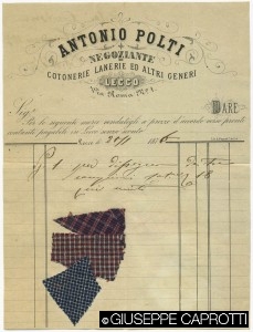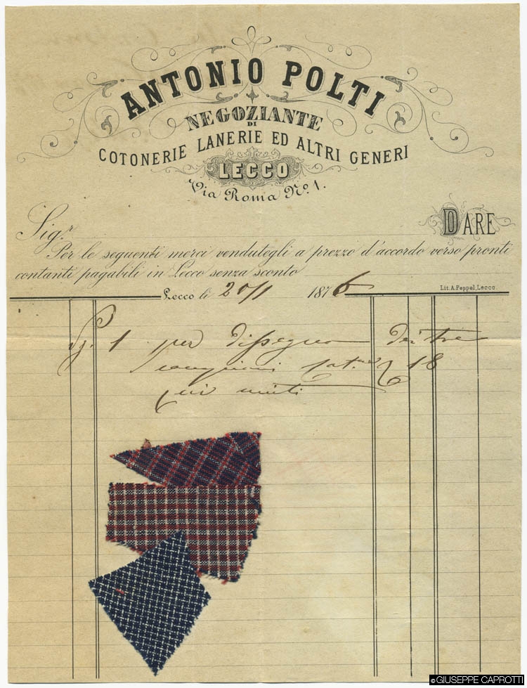 10 1876 gennaio 20, Lecc oLettera della ditta Antonio Polti mm. 140x280Si tratta di una vera ricevuta, prestampata nella ricca ed elegante grafica che usava all’epoca, in cui si quietanzava alla Caprotti il compenso dovuto per il disegno eseguito dei tre campioni di stoffe allegati.