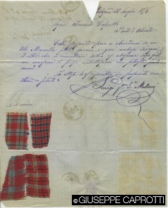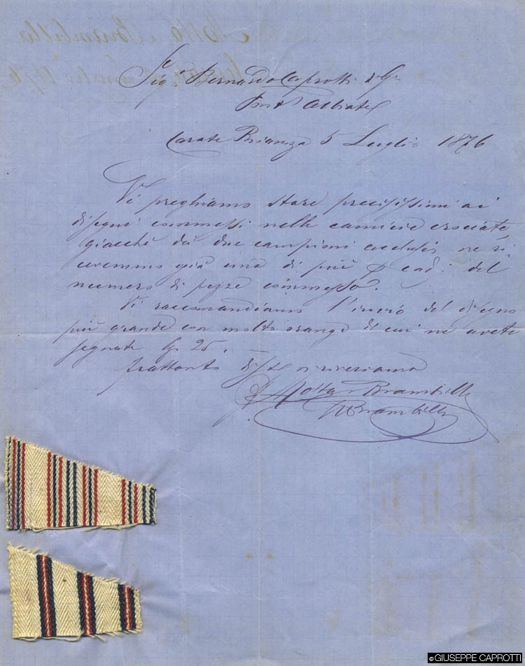 11 1876 luglio 8, Carate Brianza Lettera della ditta Motta & Brambillamm. 210x270Nel testo della lettera si specifica alla Caprotti di restare precisissimi ai disegni commessi nelle camicie crociate, perché dei due campioni acclusi ne avevano già ricevuto una pezza in più rispetto al numero commissionato. Si raccomanda poi di inviare le pezze relative al disegno più grande con molto orange, ossia molto aranciate.