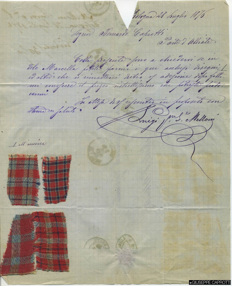12 1876 luglio 28, Bologna Lettera della ditta Melloni Luigi fu Giuseppe mm. 220×265 Luigi Melloni domanda all’azienda Caprotti se è in grado di eseguire per lui in tela Marcella i disegni che figurano sui campioni allegati, e altri che avrebbe mandato in seguito dopo aver ricevuto risposta positiva dalla ditta albiatese, chiedendo nel contempo quale prezzo ristrettissimo (ossia quale sconto) si sarebbe potuto praticargli.