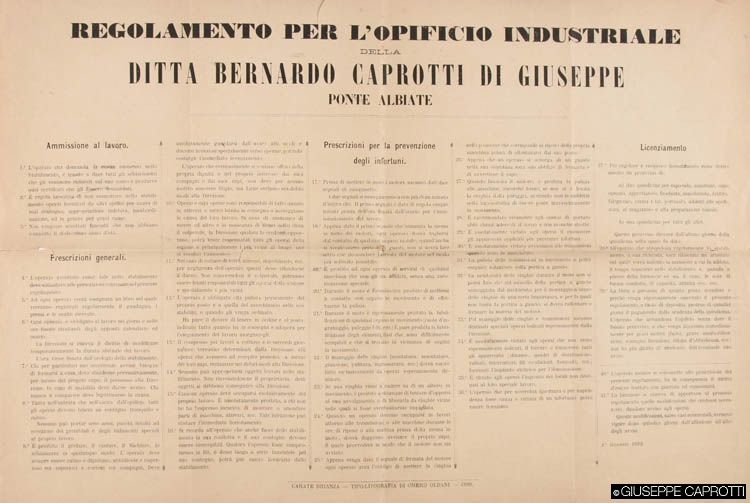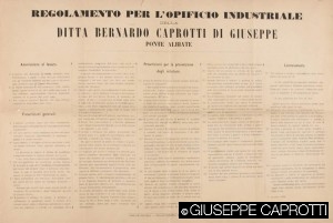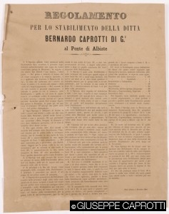 I due regolamenti mostrano l’evoluzione avvenuta in trent’anni nella gestione dello stabilimento albiatese: dalle prime, semplici regole, comprese quelle del doveroso decoro che ogni operaio doveva mantenere (si vedano ad esempio i punti 6. e 7. del primo regolamento), all’assimilazione di regole e leggi a protezione delle maestranze, a cominciare da quelle per la prevenzione degli infortuni, cui i Caprotti prestarono sempre molta attenzione (punti 17 – 36 del secondo regolamento).