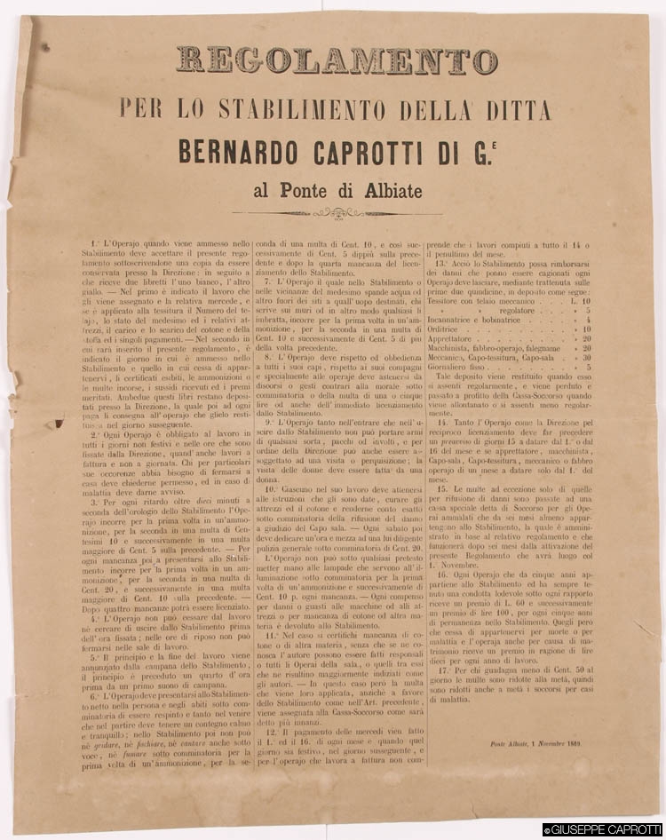 13 1869 novembre 1Regolamento per lo stabilimento della ditta Bernardo Caprotti di G[iusepp]e al Ponte di Albiate mm. 425×340