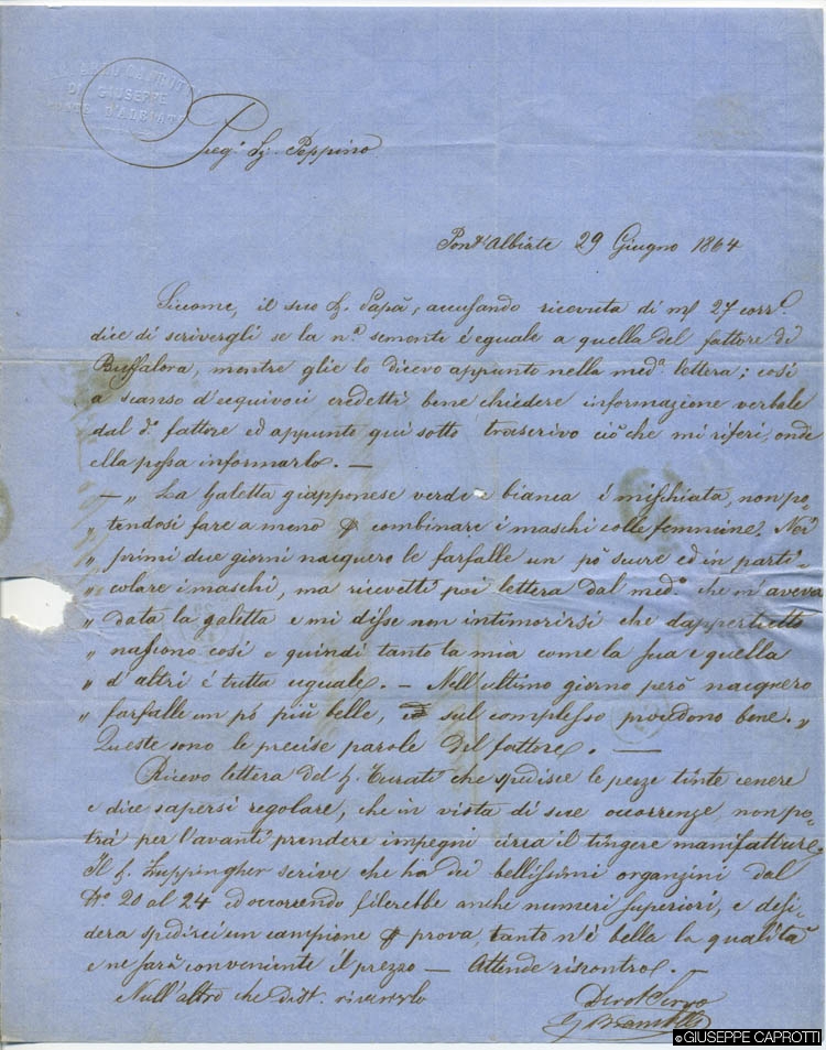 16 1864 giugno 29, Ponte Albiate Lettera dell’impiegato G. Brambilla a Giuseppe Caprotti (“signor Peppino”)mm. 200x140L’impiegato della ditta fornisce a Giuseppe Caprotti, in una grammatica un po’ stentata, informazioni che riguardano sia l’onnipresente allevamento dei bachi da seta – industria fra le maggiori della Brianza del secondo Ottocento, e interessante anche le proprietà Caprotti – sia la produzione dell’azienda tessile:Preg[iatissim]o sig[nor] Peppino/(…)/Siccome, il Suo Signor Papà, ricevuta di m[issiva] 27 corr[ente], dice di scrivergli se la n[ostr]a semente è eguale a quella del fattore di Buffalora, mentre glie lo dicevo appunto nella med[esim]a lettera; così a scanso d’ecquivoci <sic!> credetti bene chiedere informazione verbale dal d[ett]o fattore ed appunto qui sotto trascrivo ciò che mi riferì, onde ella possa informarlo./”La galetta giapponese verde e bianca è mischiata, non potendosi fare a meno p[er] combinare i maschi colle femmine. Nei primi due giorni nacquero le farfalle un po’ scure ed in particolare i maschi, ma ricevetti poi lettera dal med[esim]o che m’aveva data la galetta e mi disse non intimorirsi che dappertutto nascono così e quindi tanto la mia come la sua e quella d’altri è tutta uguale. Nell’ultimo giorno però nacquero farfalle un po’ più belle, sul complesso procedono bene”. Queste sono le precise parole del fattore./Ricevo lettera del sig[nor] Turati che spedisce le pezze tinte cenere e dice sapersi regolare, che in vista di sue occorrenze non potrà per l’avanti prendere impegni circa il tingere manifatture. Il s[ignor] Zuppingher scrive che ha dei bellissimi organzini dal N. 20 al 24 ed occorrendo filerebbe anche numeri superiori, e desidera spedirci un campione p[er] prova, tanto n’è bella la qualità, e ne farà conveniente il prezzo. Attende riscontro./Null’altro che dist[intamente] riverirlo/Devot[issimo] servo/G. Brambilla.