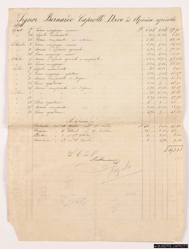 17 1896 Conti dell’azienda agricola mm. 375×280 La lista riporta gli acquisti per l’andamento dell’azienda, in generale foraggi (principalmente fieno e avena) e i cosiddetti appendizi, ossia il pollame fornito per contratto (pollastre, capponi, anitre e tacchini).