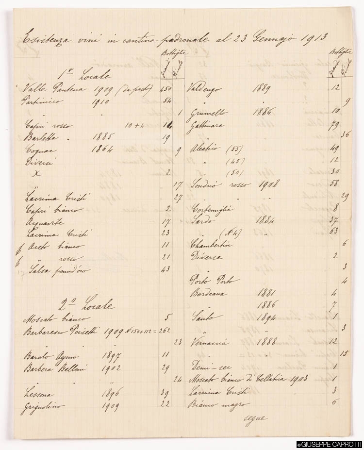 18 1913 gennaio 23 Esistenza vini in cantina padronale al 23 gennaio 1913 mm. 280×220 L’elenco dei vini e liquori conservati nella cantina Caprotti, attentamente diviso per locali e misure delle bottiglie (di cui a volte viene indicata pure la casa produttrice), riporta tipologie e annate di vini ancor oggi famosi o comunque noti, e provenienti per lo più dall’Italia: Valle Pantena, Lacrima Cristi, Grumello, Gattinara, Aleatico, Cortemiglia, Sardo, Moscato, Grignolino e altri, con l’aggiunta di liquori – cognac, acquavite – aceto bianco e rosso e, stivate nel primo locale, 43 bottiglie di salsa di pomodoro.