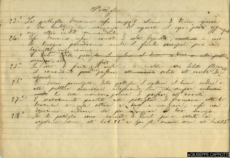 19 senza data [ma post 1859]Minuta di regolamento per la Guardia nazionale di Albiate mm. 290×210, cc. 13 La «Guardia nazionale» era un retaggio del 1848, estesa a tutto il territorio italiano con legge del 1861, completamente staccata dall’esercito, agli ordini delle autorità civili. I suoi compiti consistevano nel mantenere l’ordine interno e, se necessario, nel concorrere con l’esercito alla difesa delle frontiere. La funzione principale della Guardia, però, corpo militare vero e proprio – tant’è vero che annoverava ufficiali, sottufficiali, graduati, truppa, il cui servizio era scandito da rulli di tamburi, sbattimenti di tacchi, ordini secchi, presentatarm e quant’altro – era il vigilare al buon ordine e alla pubblica sicurezza, impedendo assembramenti sospetti e accorrendo al primo grido di soccorso per arrestare ladri e malfattori in genere. Con una specifica importante, però, e bellissima nella sua semplicità (art. 26°): adoperando le belle maniere prima di passare all’arresto.