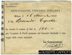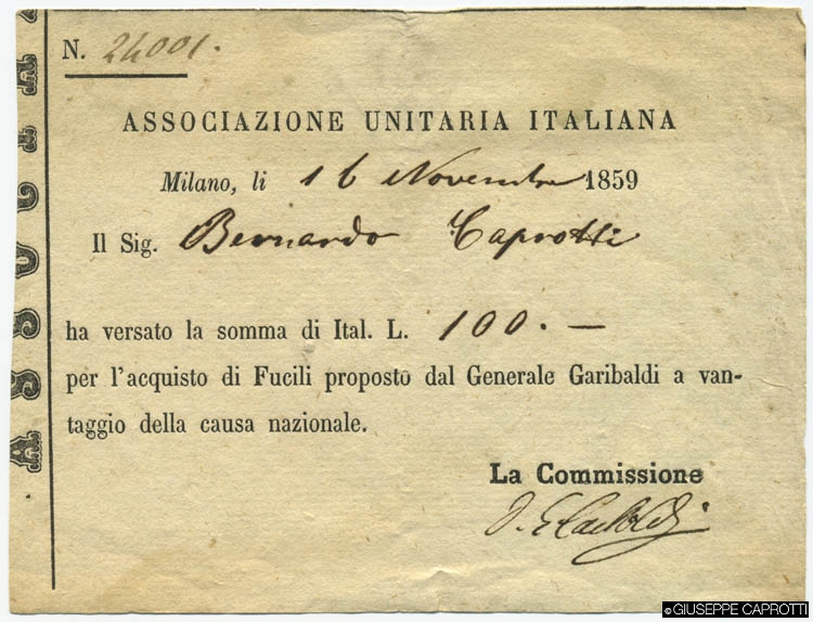 21 1859 novembre 16, Milano Ricevuta di versamento rilasciata dall’Associazione unitaria italiana a Bernardo Caprotti per l’acquisto di fucili proposto dal generale Giuseppe Garibaldi mm. 130×100